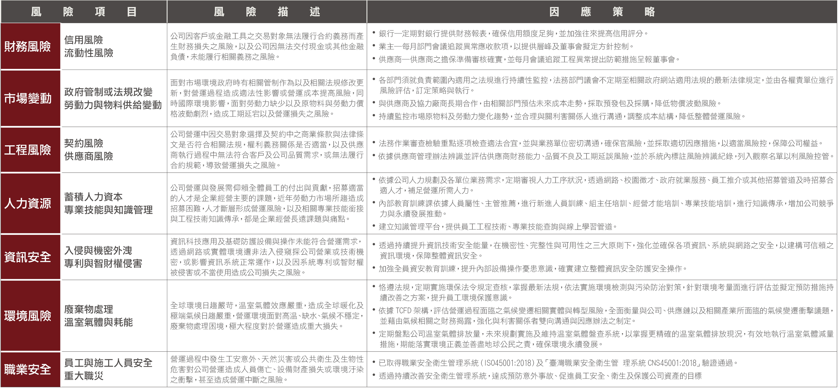 營造業是高風險行業之一,企業在營運過程中常會遭遇到許多可能威脅經營的不確定因素,互助營造為強化公司治理並健全風險管理作業,以合理確保本公司永續經營與發展,已於2018年5月14日董事會決議通過訂定「風險管理及危機處理作業守則」,並透過風險評估及辨識、確認、擬定措施、定期檢視,以落實風險管理之執行。