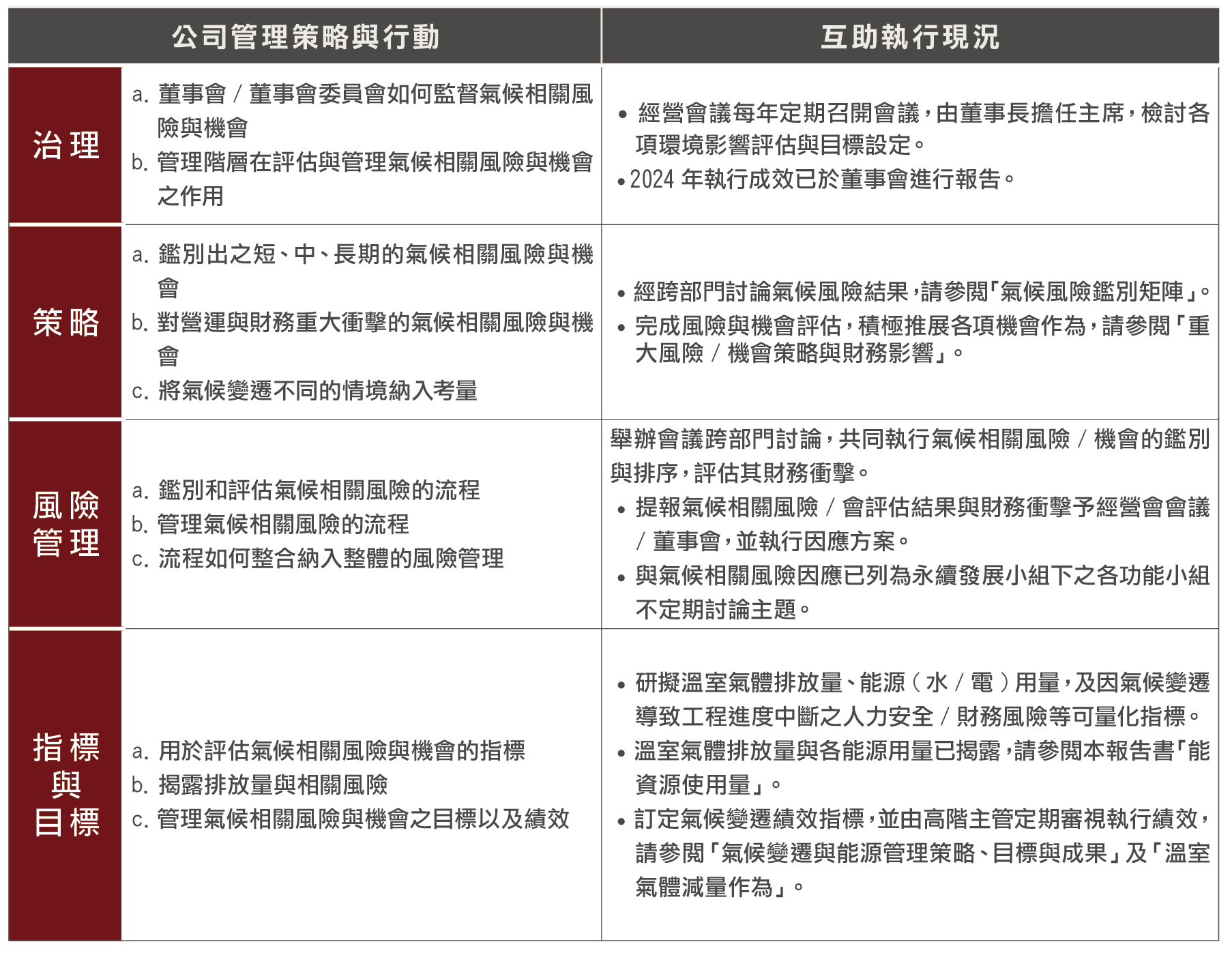 互助營造參考TCFD架構評估氣候變遷相關轉型風險,並衡量與公司本體、供應鏈以及相關產業所面臨的氣候變遷衝擊,藉由氣候相關之財務揭露與利害關係者進行溝通。互助為展現與全球共同承擔減緩氣候變遷的責任,已正式將溫室氣體與氣候變遷的議題納入ESG工作小組中之「綠色低碳」小組之討論議程當中,提出綠色工程精進方案、評估氣候變遷風險與機會、研擬節能減碳等計畫。本組受管理部所監督,定期向董事會呈報溫室氣體管理效益與氣候變遷之因應成果,作為公司長期因應氣候變遷風險策略擬定的參考基礎。