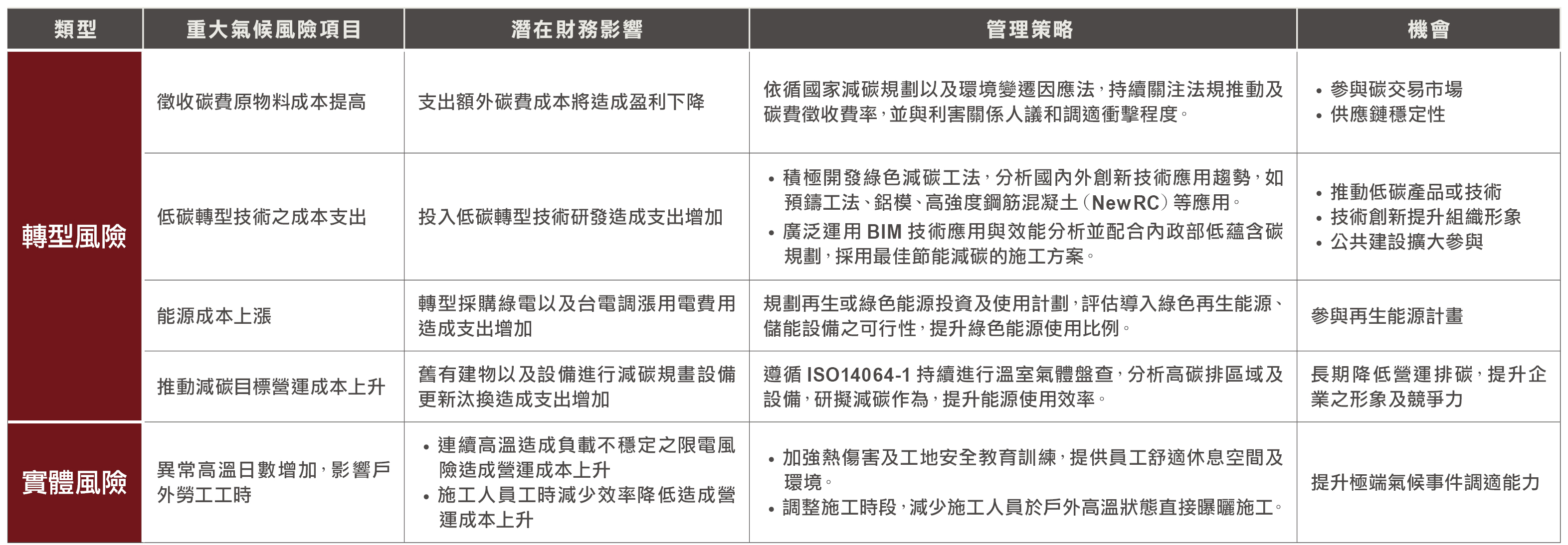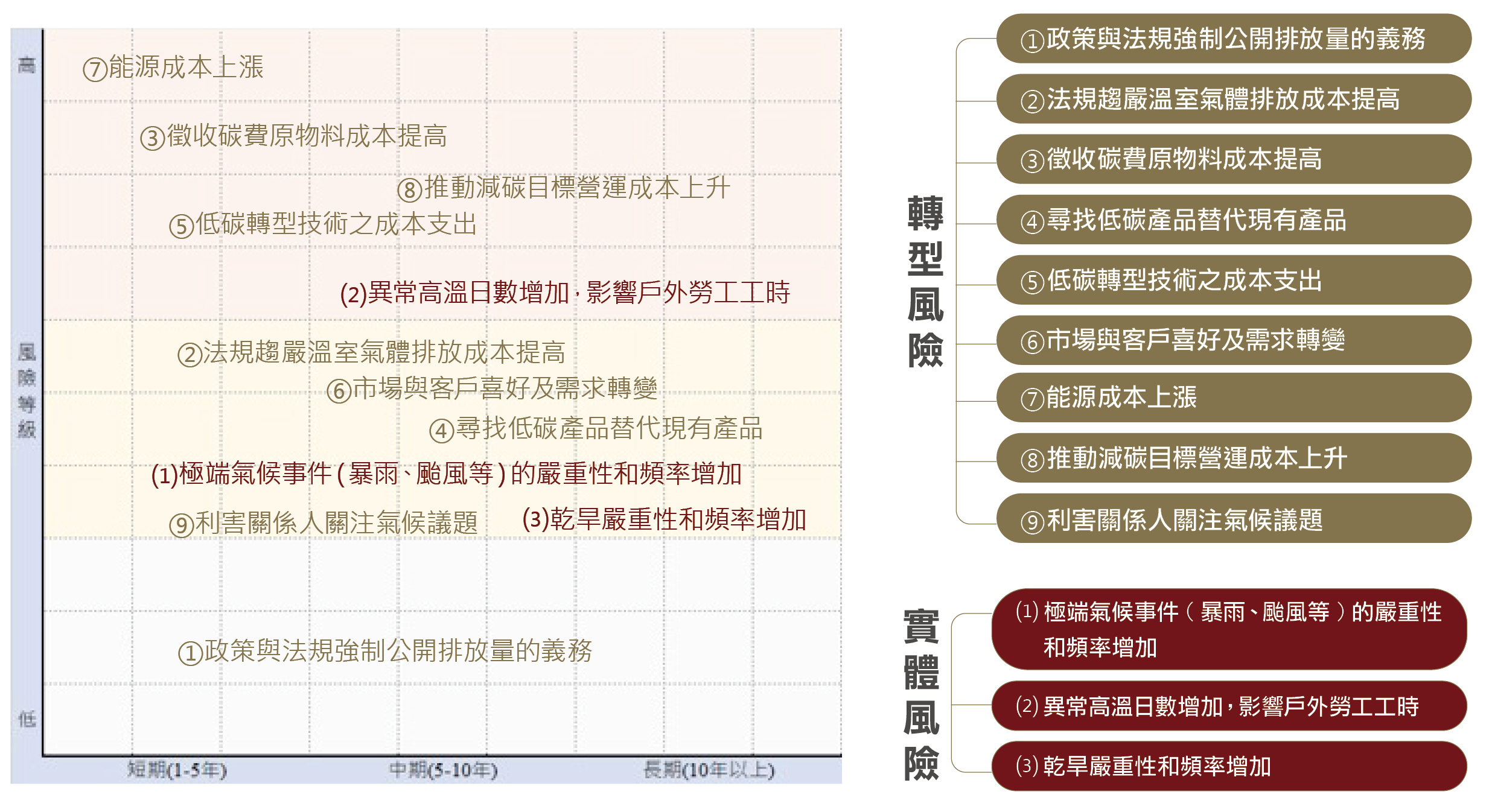 本公司參考「TCFD氣候相關財務揭露建議書(Recommendations of the Task Force on Climate-related Financial Disclosures)」,鑑別對本公司重大之關鍵氣候變遷風險與機會,並依據辨識結果執行相關因應方案。